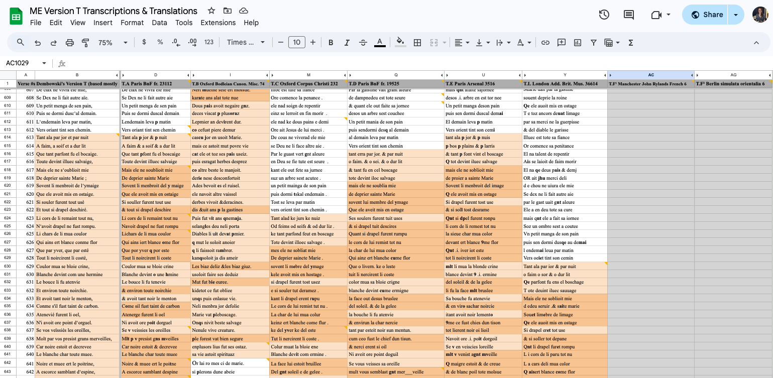 Prior to diving into the XML encoding, I transcribed each manuscript of Version T — working from both the digitized images of the manuscripts and my own collected images — into a basic Google Sheet,16 with each verse occupying its own cell.17 This early stage served as a no-code method that organized the texts in a manipulable, shareable format, and by adding color coding to this spreadsheet to highlight the major narrative scenes as they appear across the manuscript copies, I was able to quickly recognize key areas of interest and direct the focus of my subsequent research: