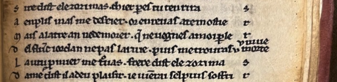 It is as though the scribe wanted to emphasize Mary’s simultaneous, ambiguous state as both alive and dead at once. Yes, it is possible this was merely a choice made for the sake of maintaining the spacing of the line — based on the end rhyme of this couplet, it is clear that “u vive” should follow “u morte” — but because this is the only instance in the entire copy where the scribe has stacked words in this way to compress a couplet into a line,8 I see potential here to read this juxtaposition as intentional. It is possible that this small scribal gesture demonstrates a profound understanding of the Christian messaging embedded within this verse as Mary’s state of being is meaningfully paradoxical: while her earthly body may be bound for death down on Earth, her spiritual being is destined for eternal life up in heaven. Regardless of the scribe’s unknowable intentions, the editor is nevertheless left with the practical question of how best to share the fact of this scribal choice in such a way that informs without dictating.9 While digital editing methods may offer more options in how to render this copy — potentially even in a dynamic way with “u vive” bouncing between the outer margin and the interlinear space where it currently sits — verses like this demand first and foremost the expertise and judgment of the human editor. The application of digital technologies does not automatically resolve such fascinating moments of tension to be discovered in the manuscript record — nor should it.
